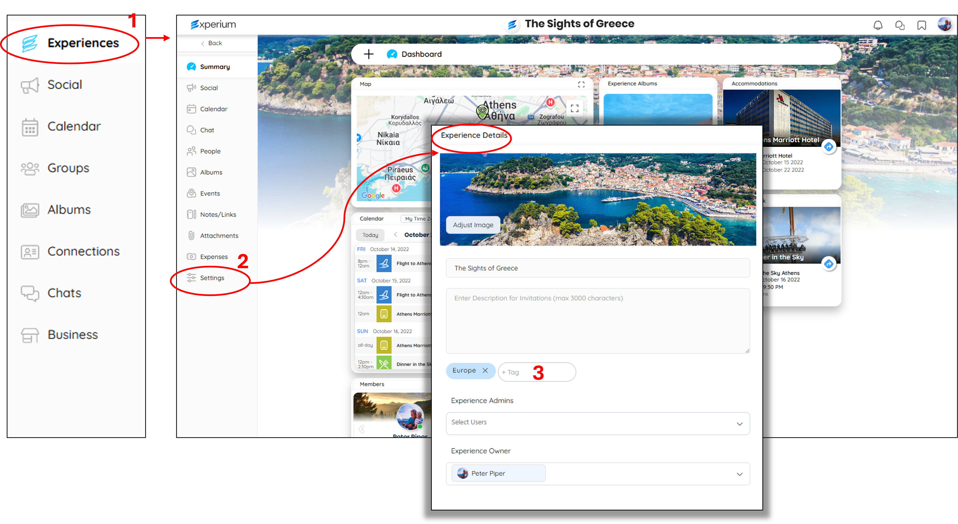 - Choose the Experience you want to add tags to by clicking on Experiences (1) on the main screen. Select your Experience