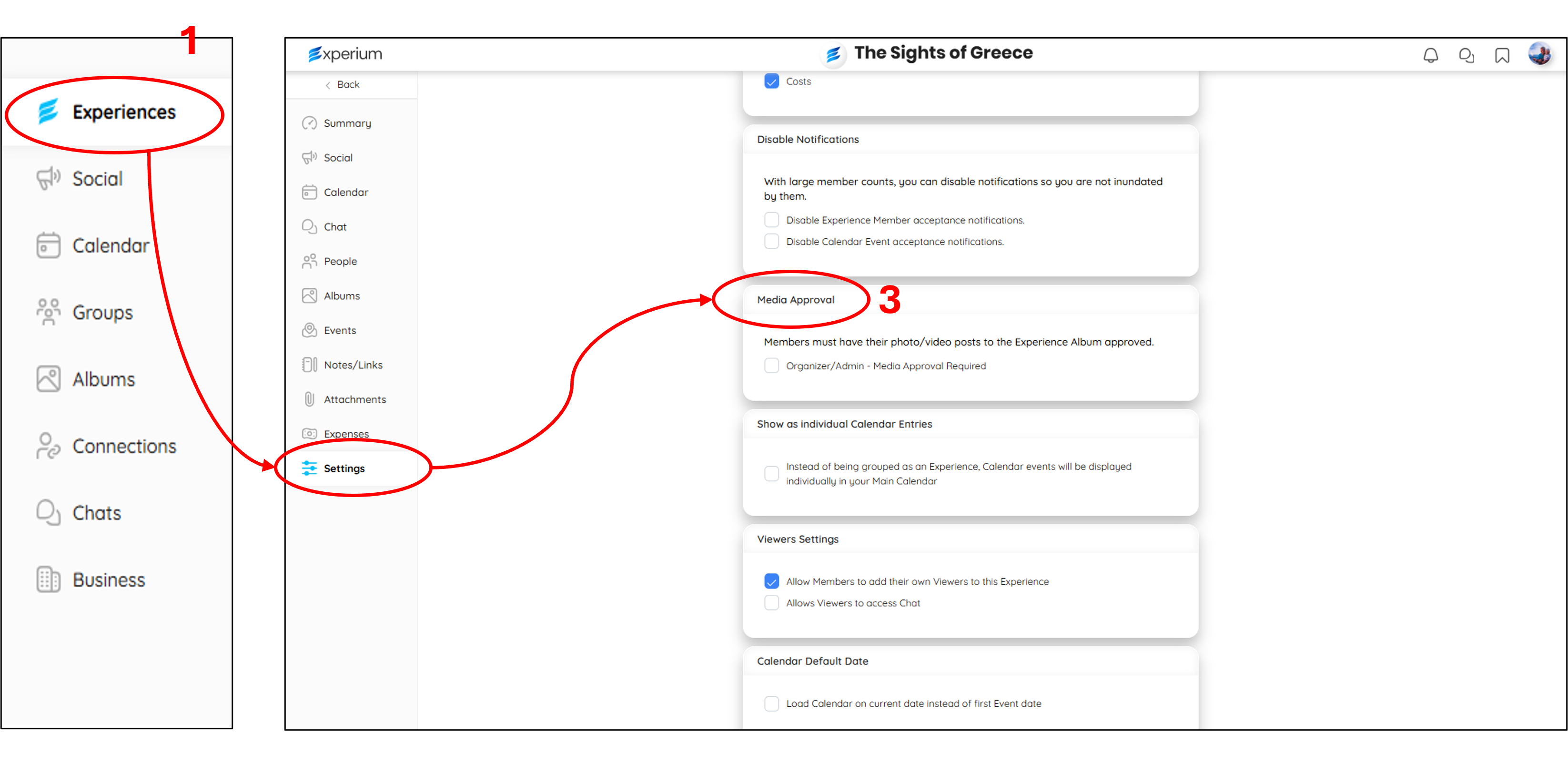 - Once inside your Experience, click on Settings (2) and then scroll down to Media Approval (3). Here you select image approval (4).