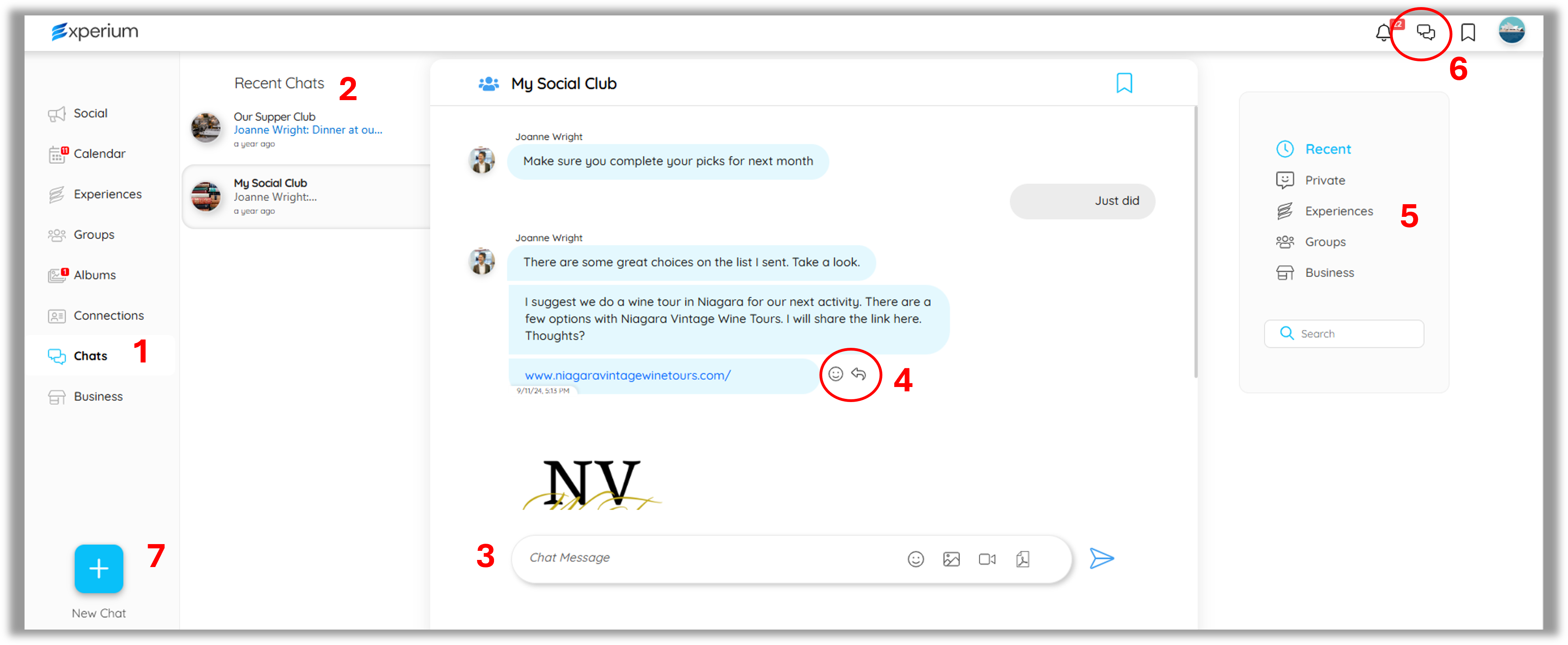 - Click on the Chat tab on the left side of the screen (1) or at the Chat icon at the top right (6).