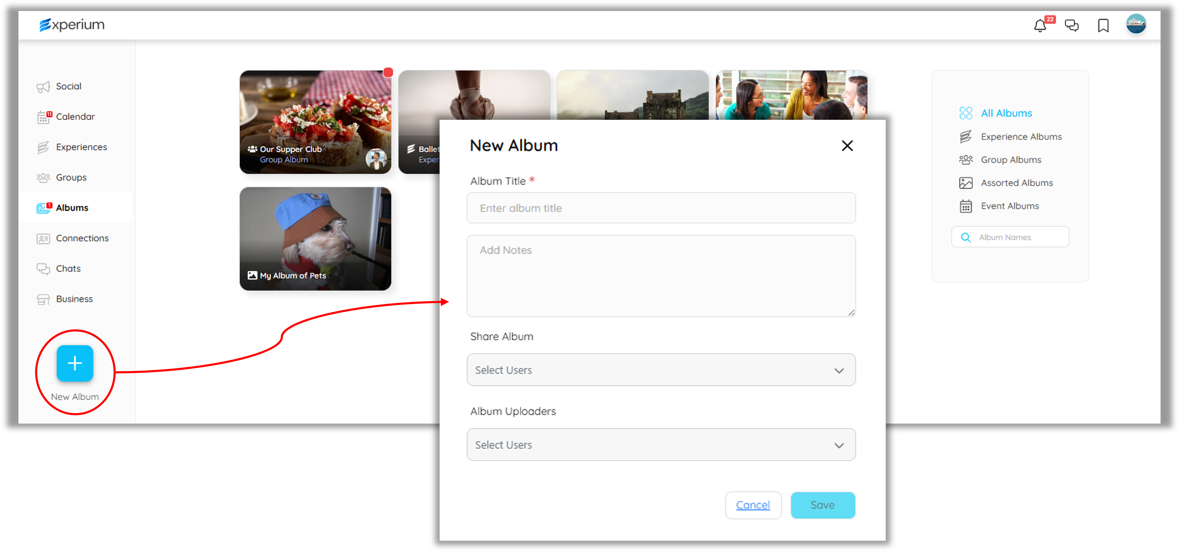 Create an album within an Experience or Group: