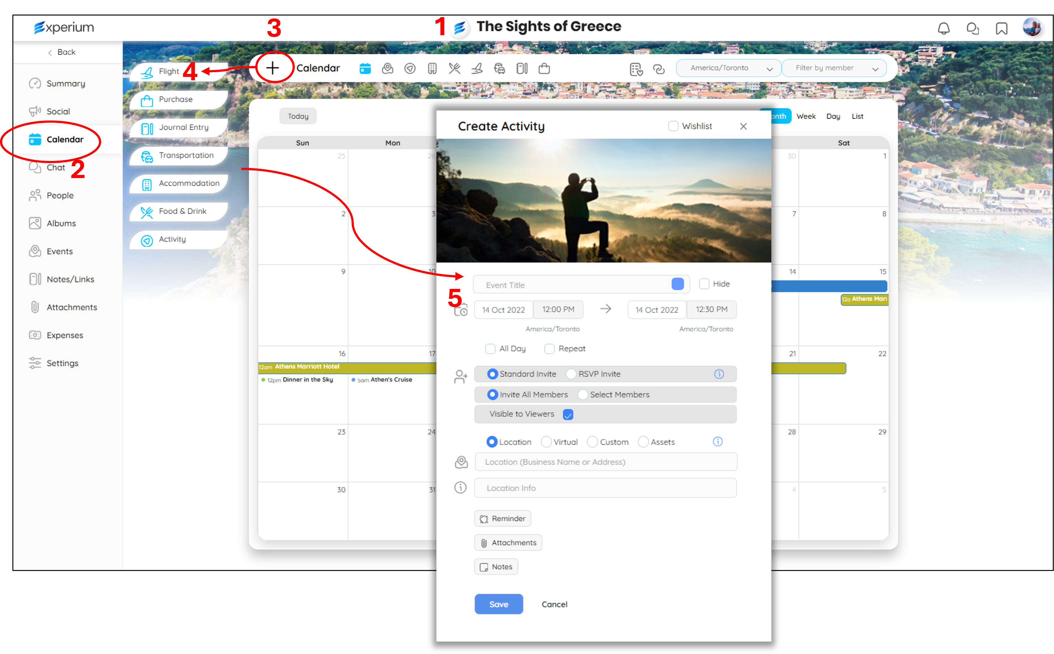- Click the + button on the Calendar bar (3). Choose the type of Event (4) - you can add an Activity, Food & Drink, Transportation, Accommodation, Purchase or Journal Entry Calendar Event. Then complete the information in the popup (5).