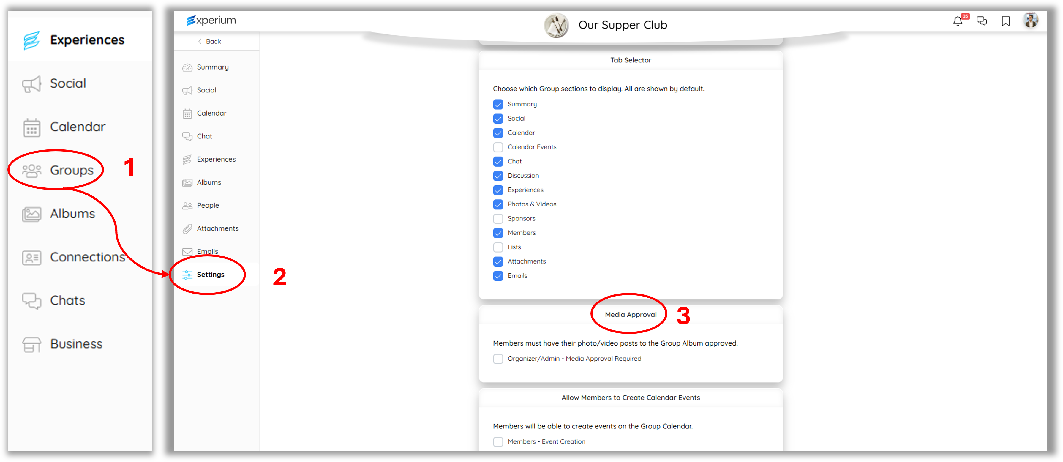 - Inside the Group, select the Settings tab (2) and then scroll down to the Media Approval section.