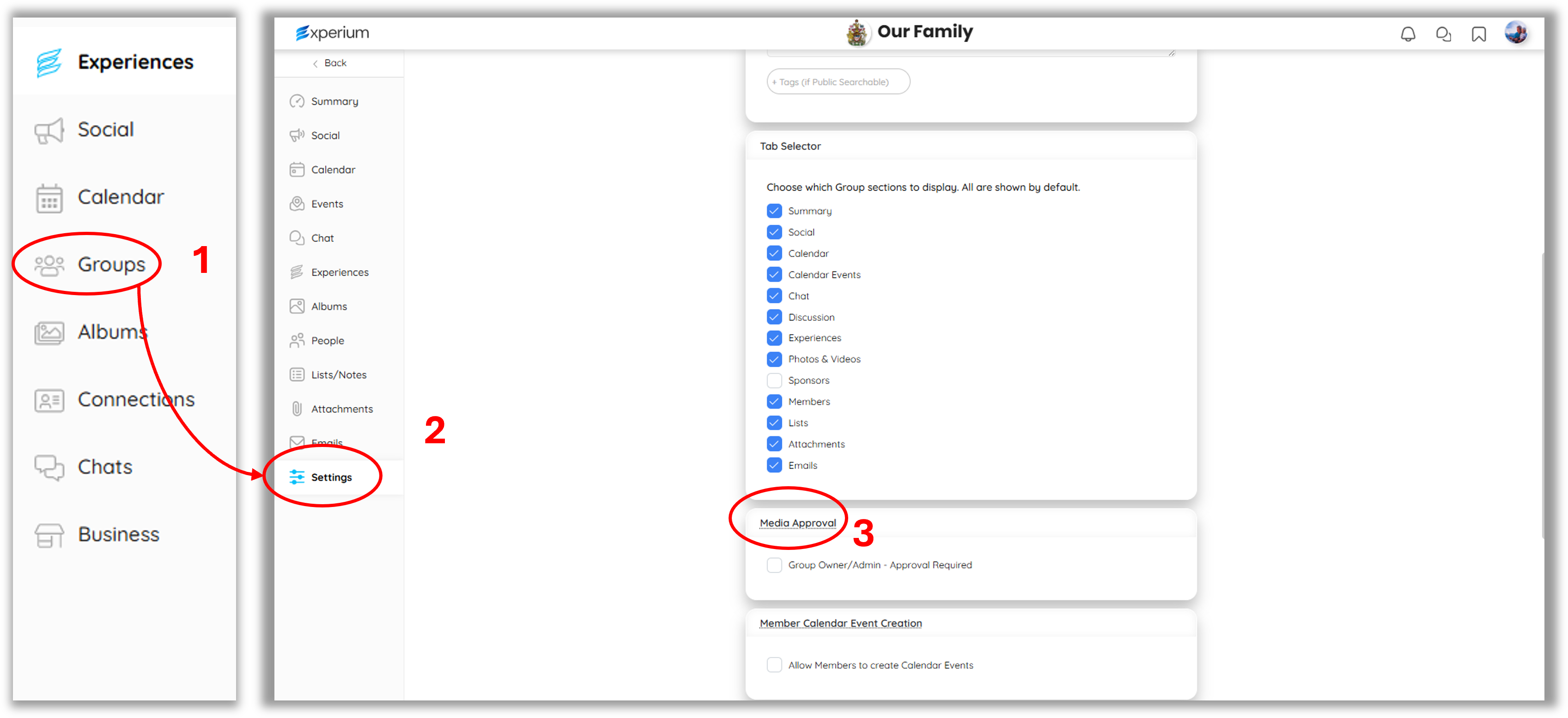 - Inside the Group, select the Settings tab (2) and then scroll down to the Media Approval section (3).