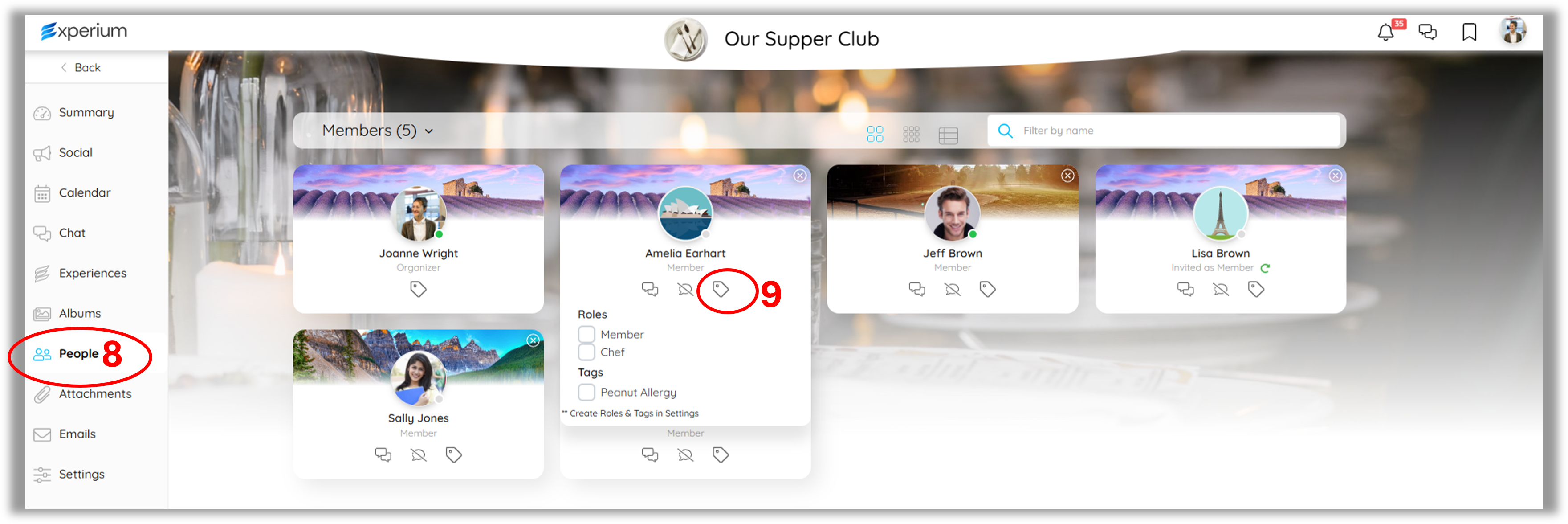 - Now you can attach the roles to members of the Group by clicking on People (8) and selecting the Tag icon (9) on the appropriate member. You will see your roles here.