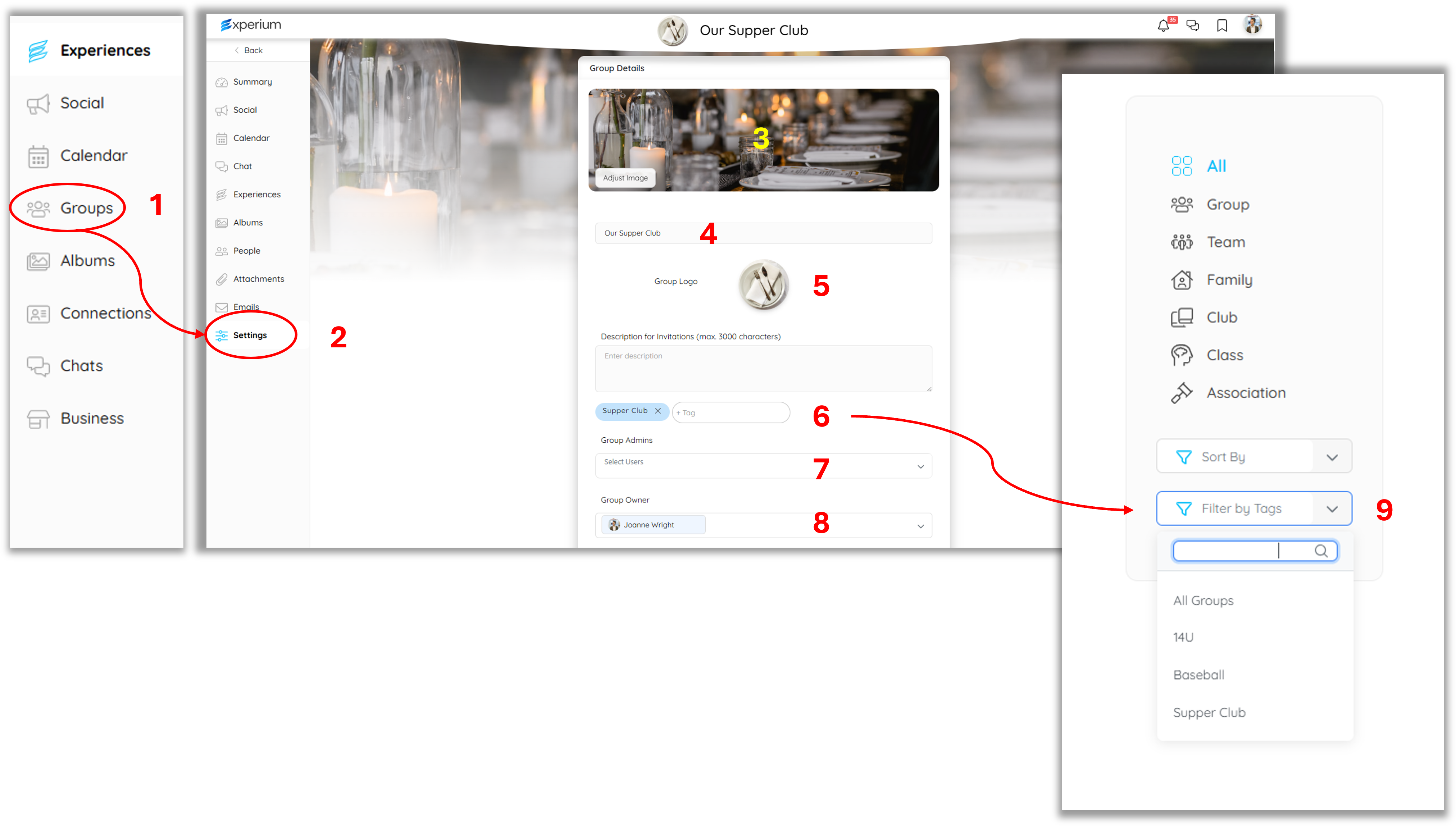 - Once you have created your Group Tags, you can use them to search on your Group page if you have many groups. Simply click go back to your main Experium screen, click on your Group Tab and then click in the Filter by Tags area (9). Your Tags will appear here.