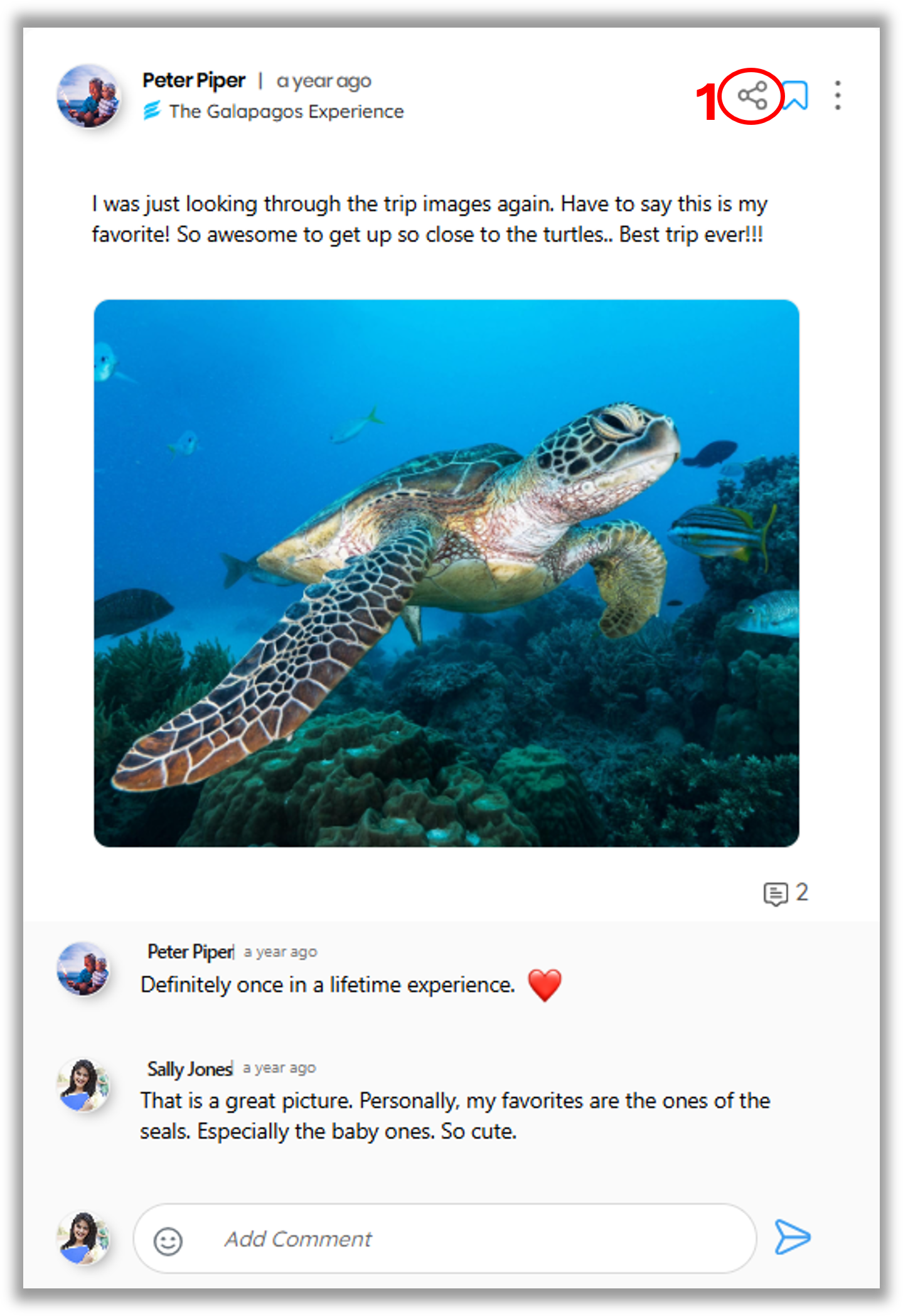 To share a social post, click on the share icon (1), then add your own comments and select whom you would like to send it to (by connection, group, experience or tag).