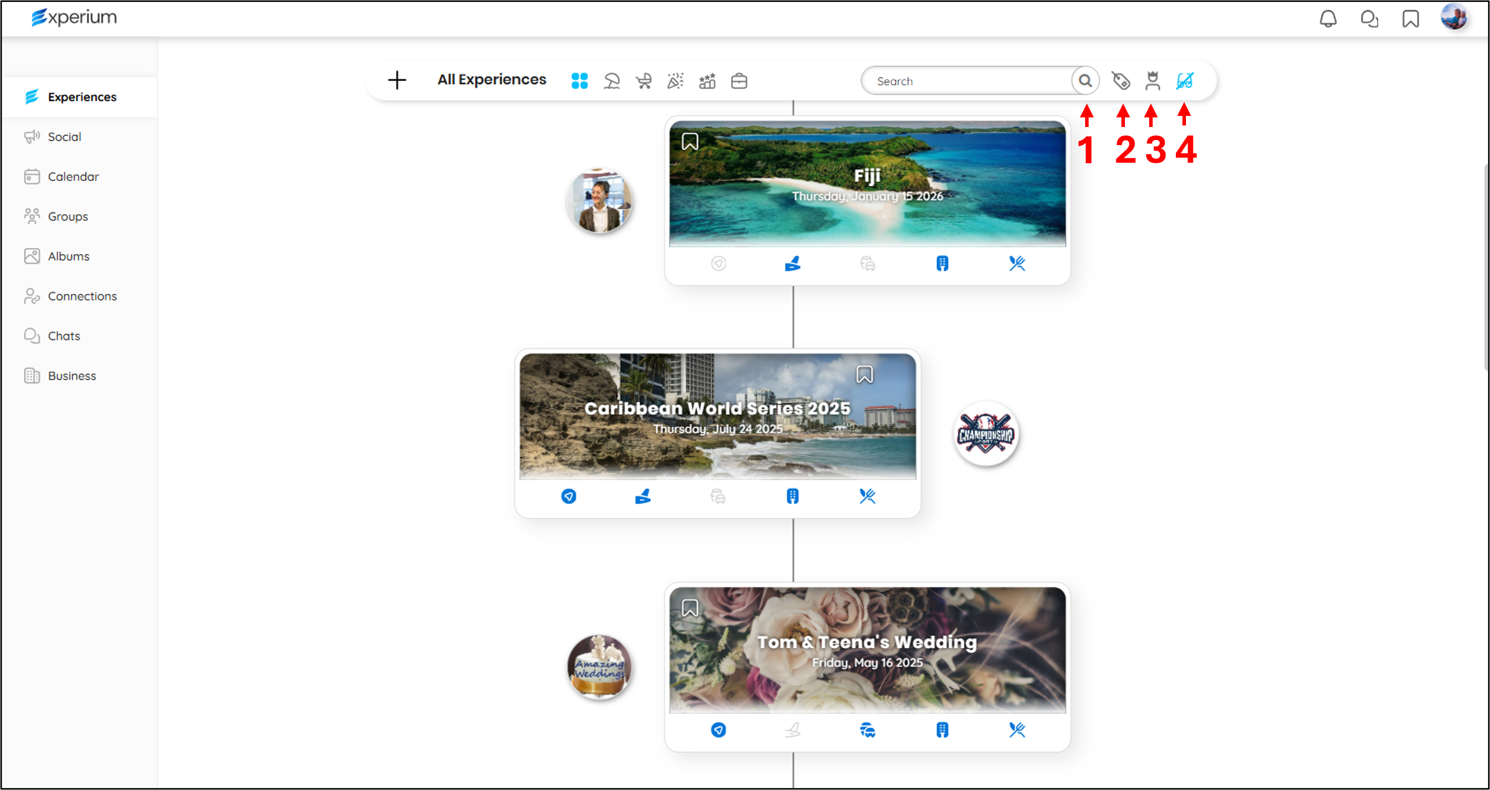 You can filter by tag if you have many Experiences. You can also filter by searching on the name. Click on the search icon (1) to open the search bar and enter your search. You can search by tag. Click on the tag icon (2) and select your tag. Note, tags are added by experience owners in the experience settings. You can also filter by experiences created by you or others. Click on the person icon (4) to make that selection. And finally, you can hide experiences you are only a viewer of. Click on the glasses icon (4) and select.
