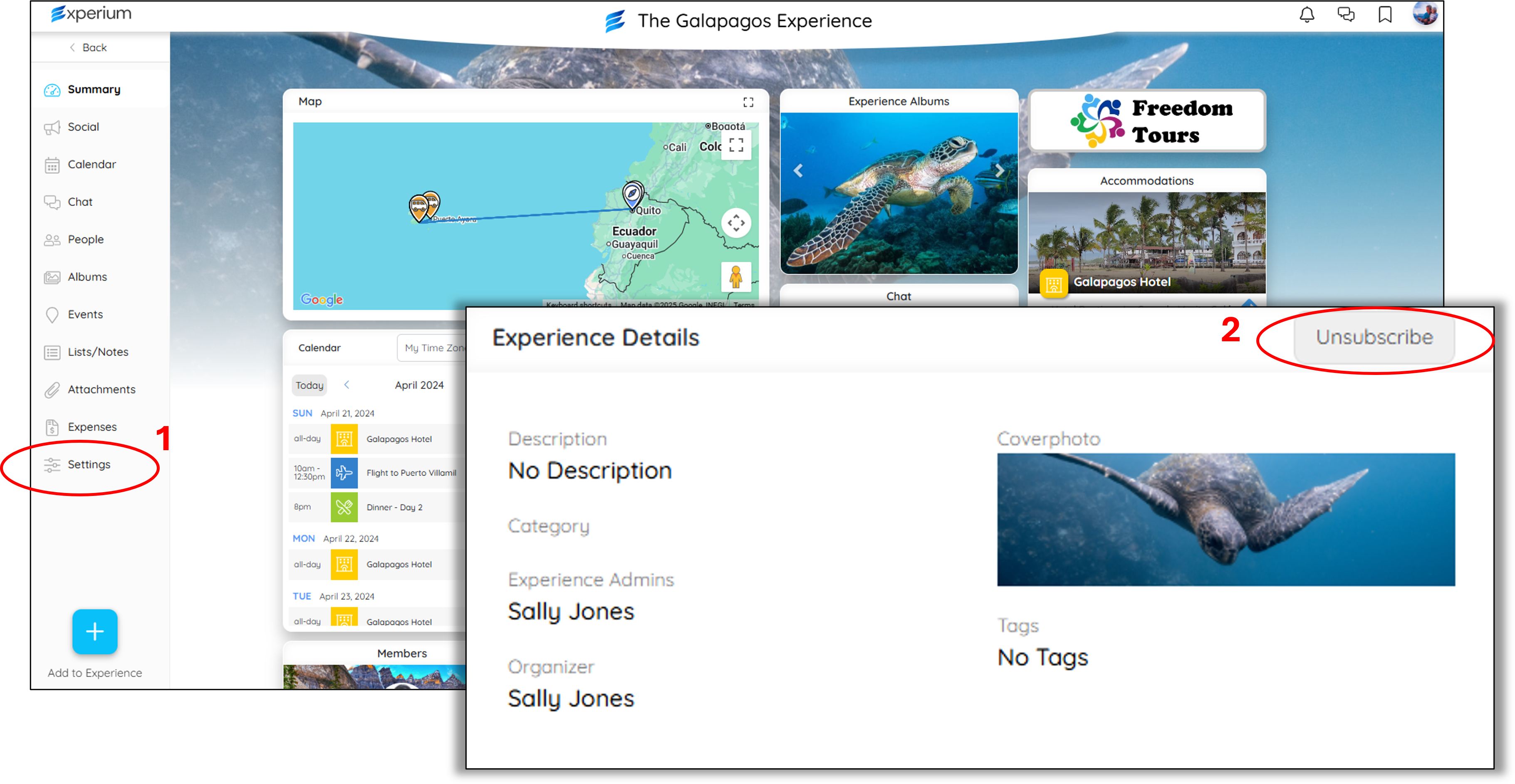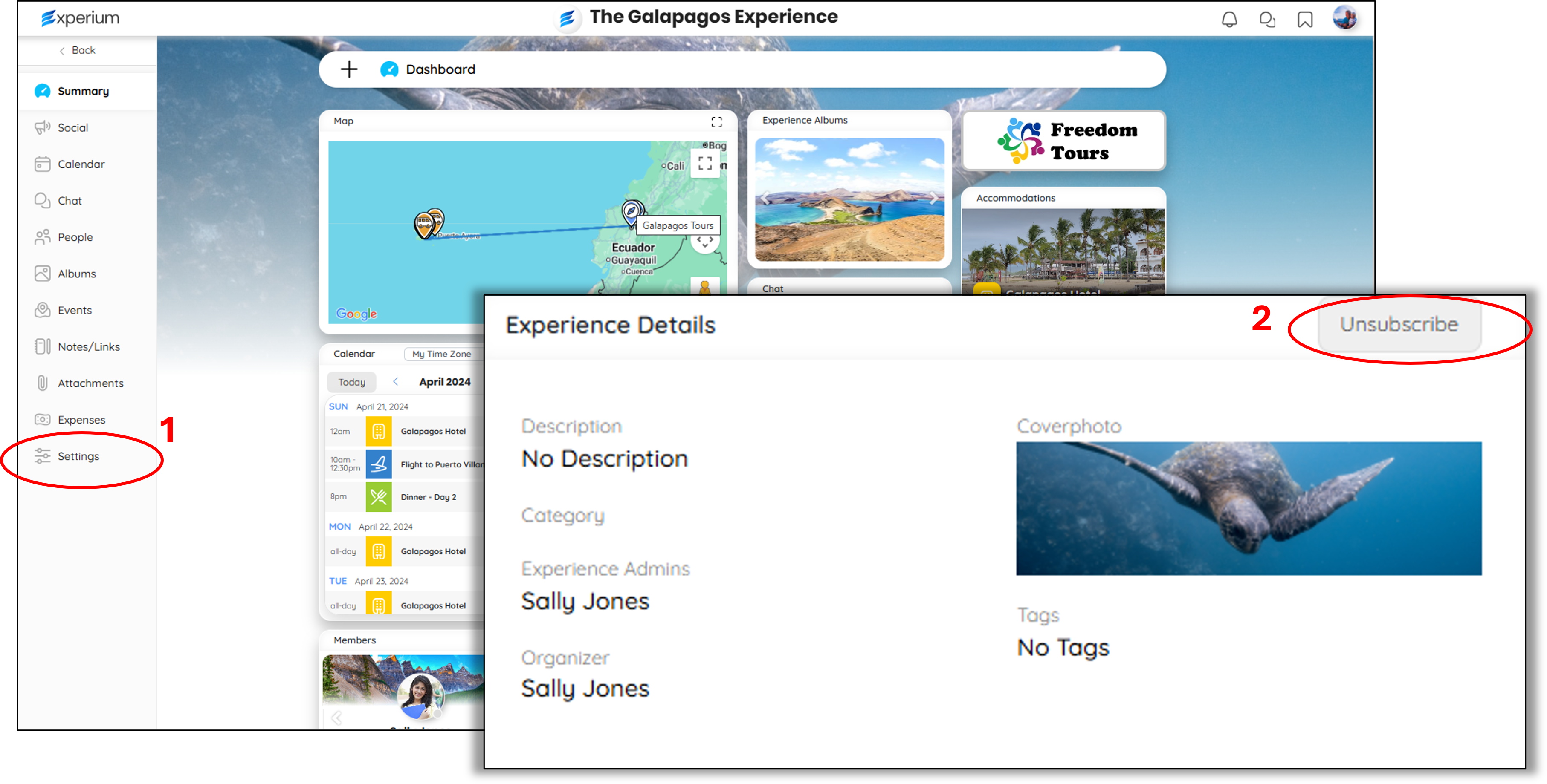 - When inside the Experience you want to unsubscribe from, click on Settings in the bottom left of your screen (1).