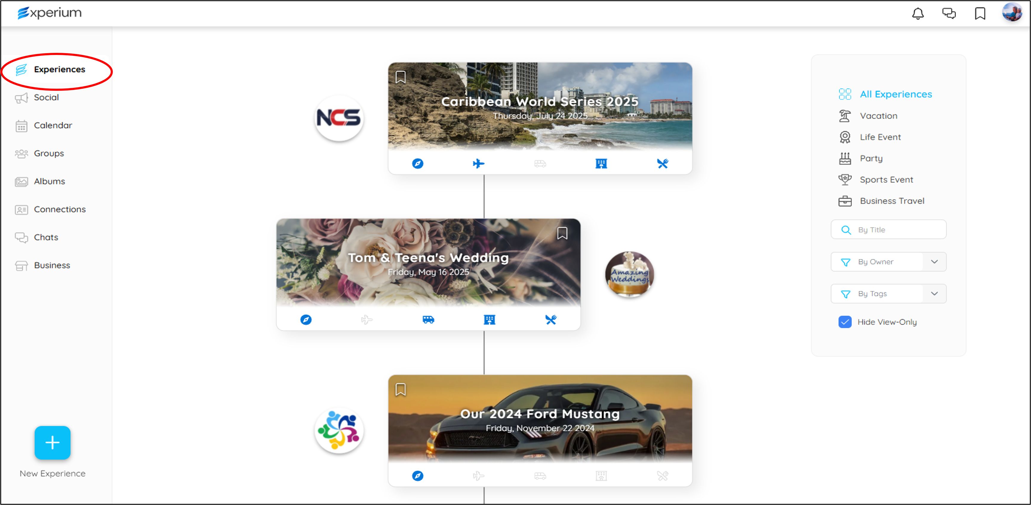 Photos: Each Experience gets a dedicated and shared Experience Album. Members can create their own (shareable or private) albums in this area.