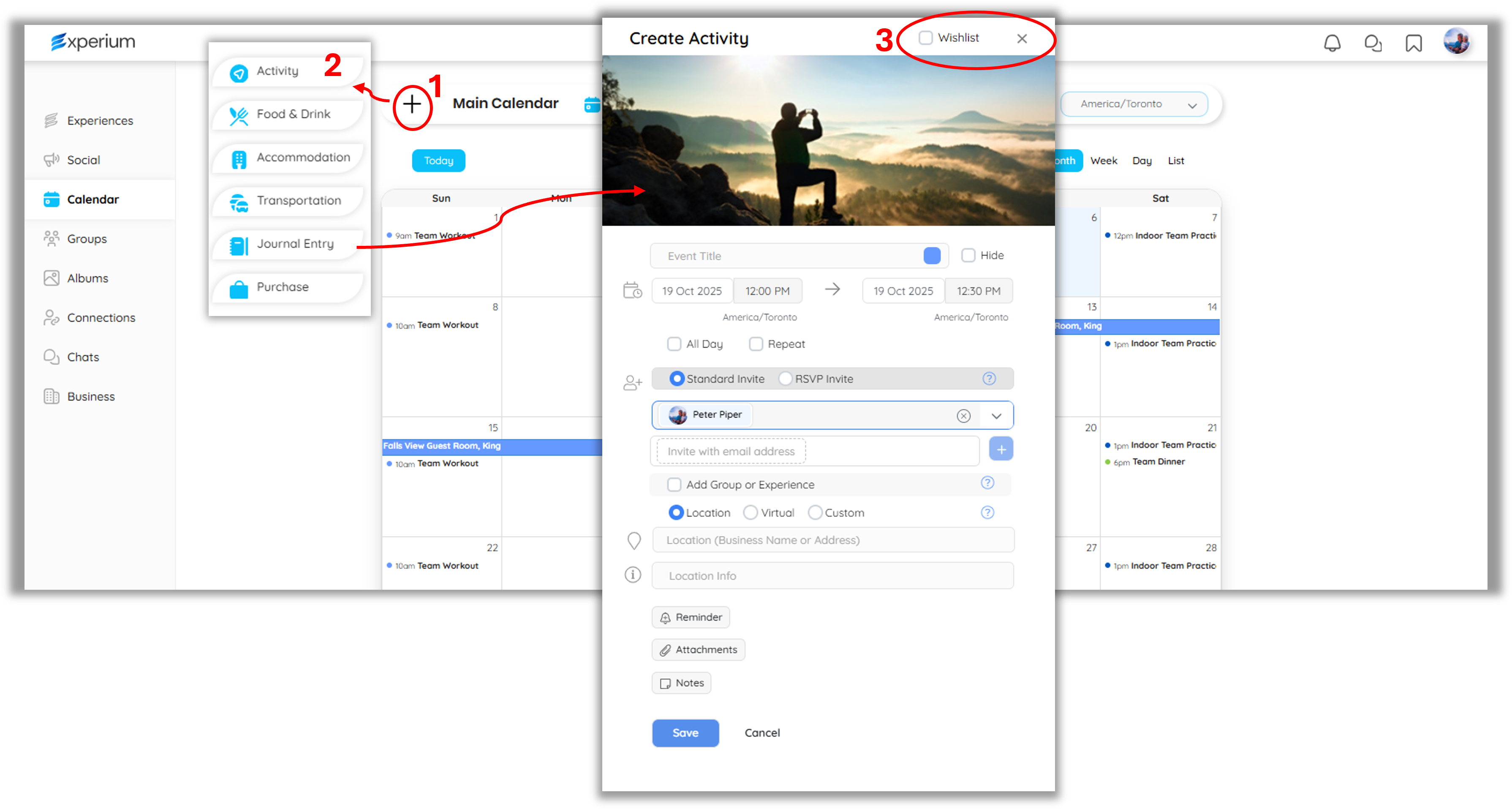 - Here you add in all the details for your new Calendar Activity, including making it a Wishlist item (3) if you don't have a date yet. When you click on Wishlist, all the date fields will disappear.